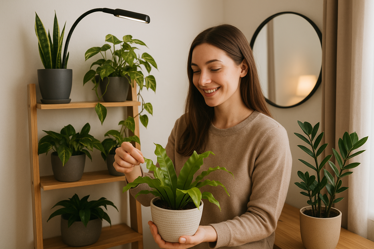 A Brooklyn renter might place a ZZ plant under a desk lamp, snake plants near a hallway lamp, and a peace lily under a grow bulb timer — all sharing ambient light from different angles.